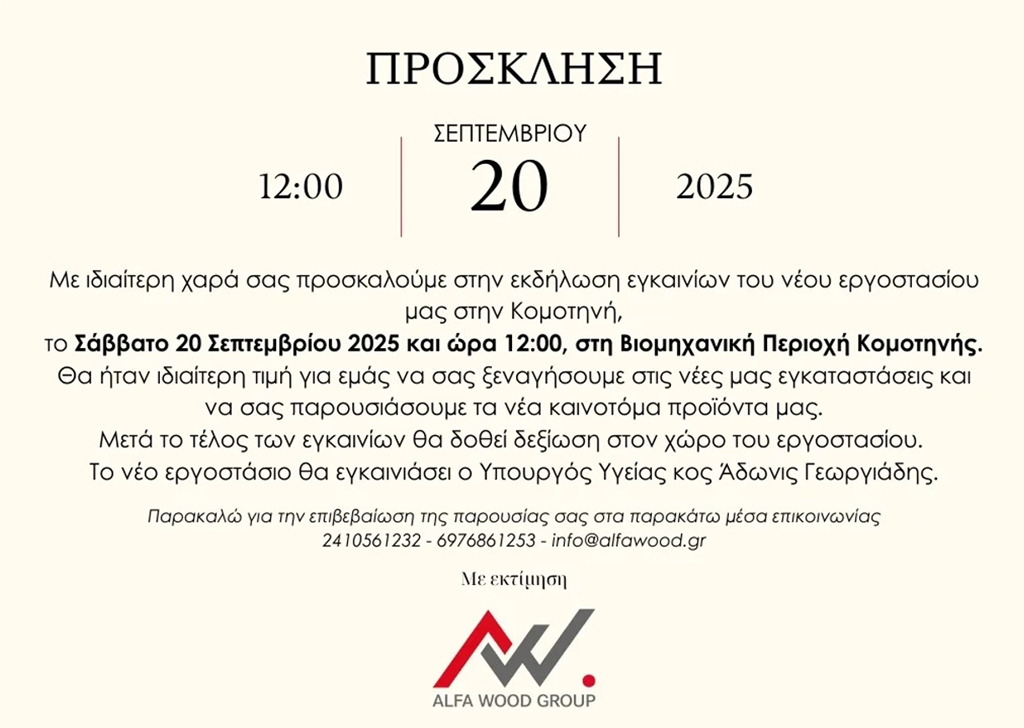 Η ALFA WOOD GROUP, με ιδιαίτερη χαρά ανακοινώνει την επανέναρξη της λειτουργίας του εργοστασίου της, στη Βιομηχανική Περιοχή της Κομοτηνής.